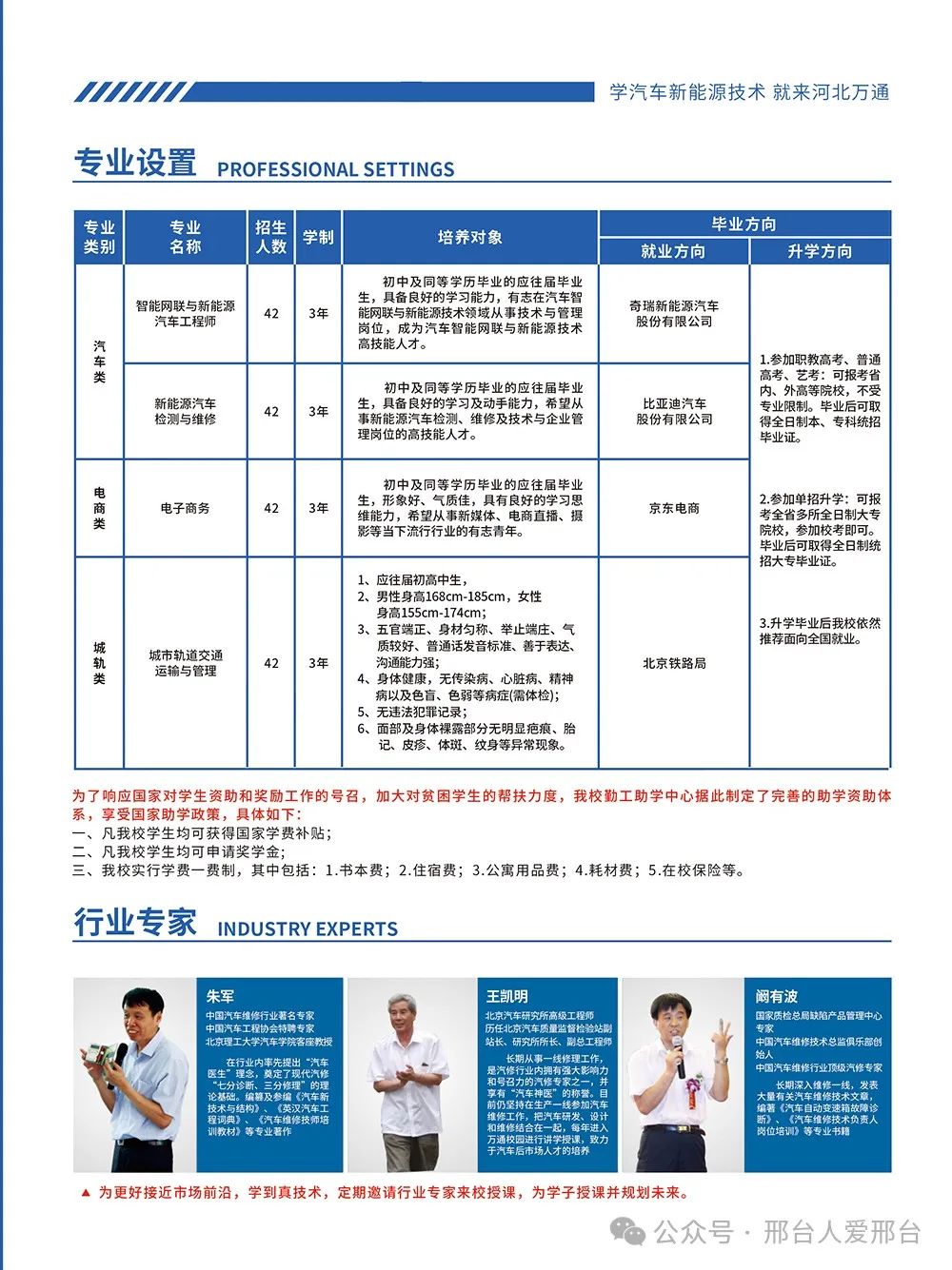 河北万通技工学校以汽车类专业为特色、涵盖计算机类、电商类、轨道类、形象设计类等专业,学校坐落于京畿重地—石家庄。学校始终秉承“立德树人、质量立校、特色强校”的办学理念,全面实施职素教育;坚持以服务经济为宗旨,以稳定就业为导向,以提高升学质量为重点,健全德技并修、工学结合的育人机制。