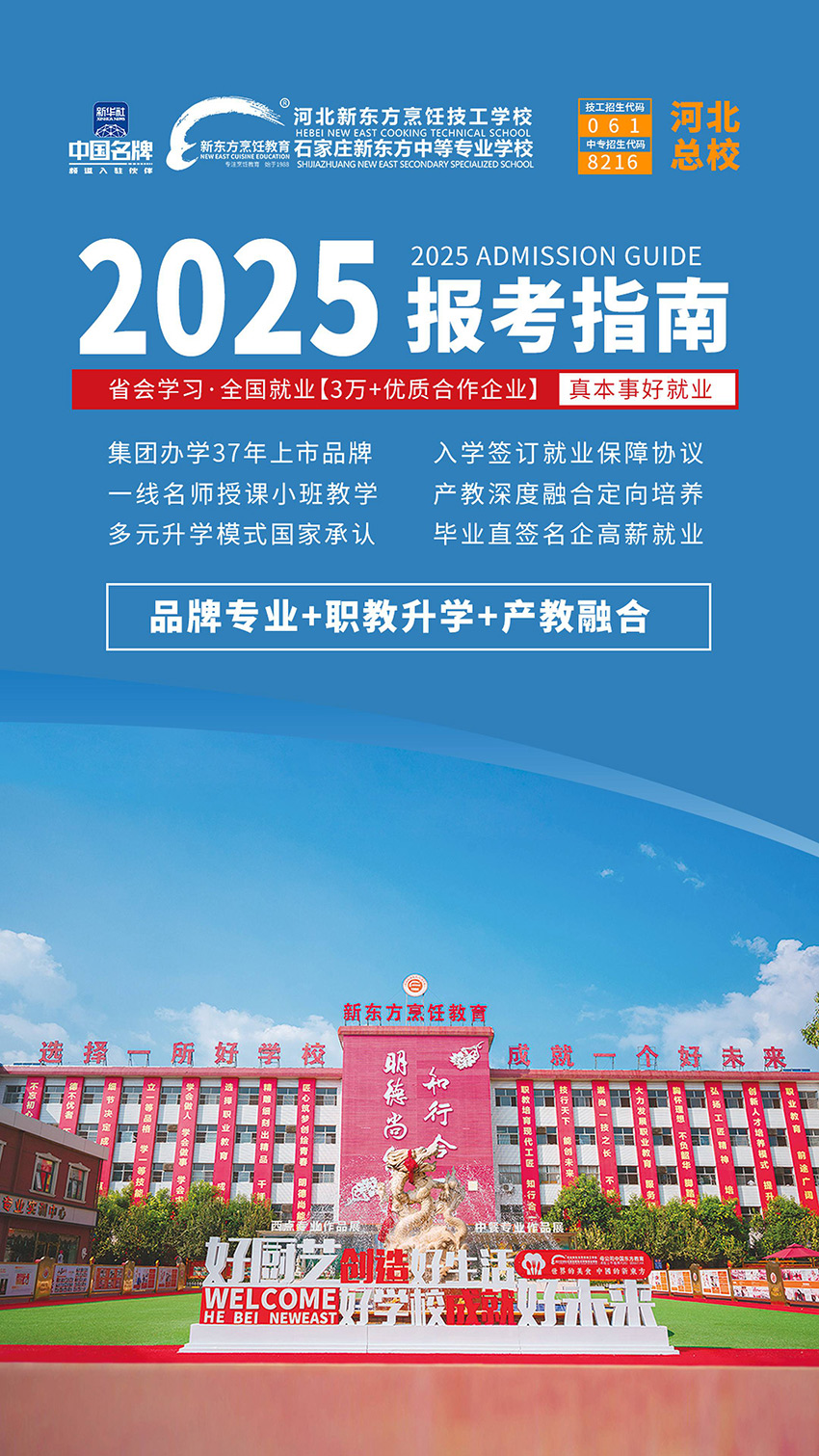 石家庄新东方烹饪学校(石家庄新东方中等专业学校)是由上级行政主管部门批准设立的一所集中专学历服务教育、职业技能培训为一体的全日制学校,是职业技能鉴定所认定的具备厨师培训资格的职业学校,是和全国数千家宾馆、酒店合作委培的国家大型专业烹饪人才培训基地。学校位于河北省石家庄市栾城区张举路43号,校园环境优美,学术氛围浓郁,教学设施先进,师资力量雄厚,拥有宽敞明亮的理论教学厅、多功能实习大厅、标准化演示大厅、模拟酒店、时尚西点教学店等教学场所,是热爱烹饪事业的有志青年学习烹饪的理想学校。